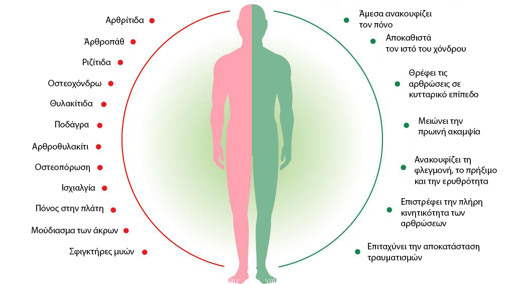 Υπάρχουν μόνο 2 βασικές αιτίες των παθήσεων των αρθρώσεων. Η διαταραχή στη λειτουργία του ανοσοποιητικού συστήματος και η φθορά του χόνδρου σαν αποτέλεσμα των δυσμενών συνθηκών ή της ηλικίας. Σύγχρονα φαρμακευτικά σκευάσματα δεν απομακρύνουν ούτε μία αιτία σε αντίθεση με το έλαιο κάνναβης. Τα βιοενεργά συστατικά ενδυναμώνουν τις αρθρικές μεμβράνες και βελτιώνουν την ανοσία του χόνδρινου ιστού, ρυθμίζουν την κυκλοφορία του αίματος, συμβάλλουν στην ενεργή νεογένεση κυττάρων και την ανανέωση όλων των ιστών της άρθρωσης.